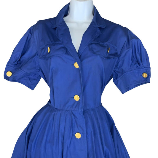 VTG 80s 'YVES SAINT LAURENT' BLUE SHORT SLEEVED LINEN A-LINE PLEATED DRESS M 14