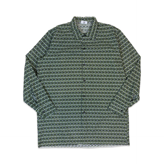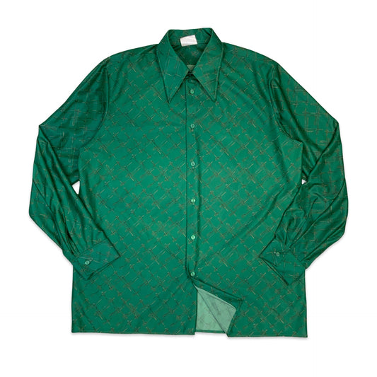 70s Green & Gold Riding Crop Print Dagger Collar Shirt XL
