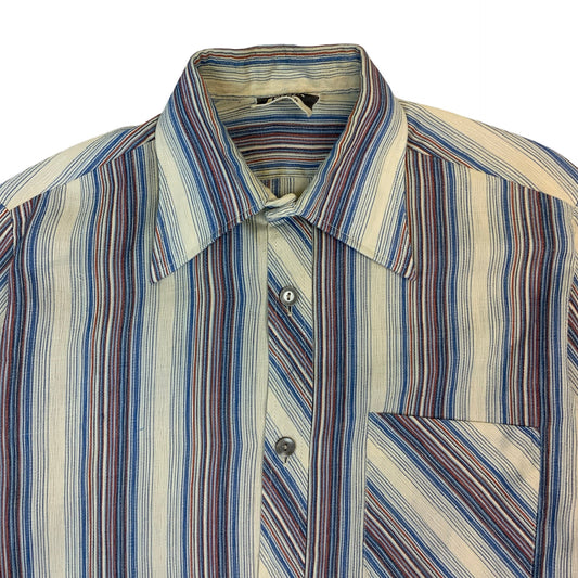 70s White Red & Blue Stripey Dagger Collar Shirt M