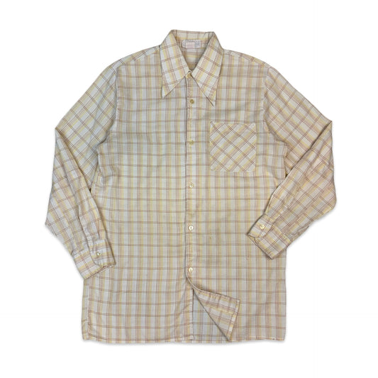 70s Cream Yellow Orange Plaid Dagger Collar Long Sleeve Shirt S M