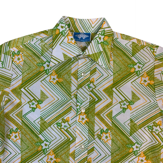70s Green White & Orange Geometric Print Dagger Collar Shirt XS S