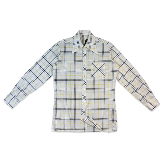 70s White Grey Yellow Checkered Dagger Collar Shirt M L