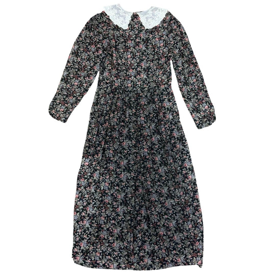 80s 'Laura Ashley' Black Floral Cottage Lace Collar Autumnal Midi Dress UK 8