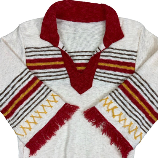 Vintage 80s White Red Yellow Brown V-Neck Tassel Jumper Top 8 10