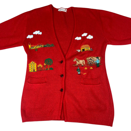 VTG 70s 80s RED WOOL BUTTON GRAPHIC APPLIQUÉ EMBROIDERED FARM SCENE 40” M