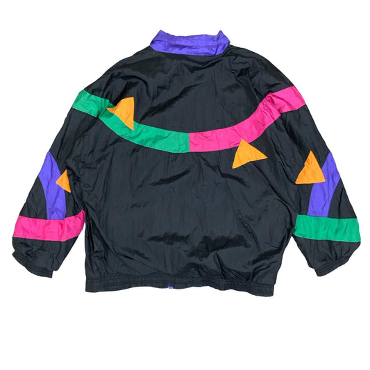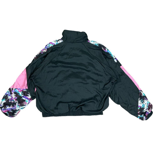 VTG 80s 90s 'CASUAL ISLE' BLACK GREEN PINK GEOMETRIC ZIP-UP SHELL JACKET 2XL
