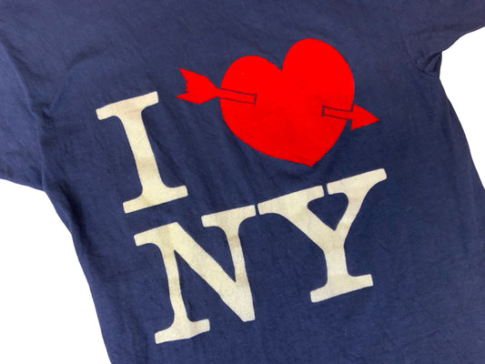 VTG USA 1980s SINGLE STITCH T SHIRT FLOCK PRINT I LOVE NEW YORK NY ARTEX BLUE XS
