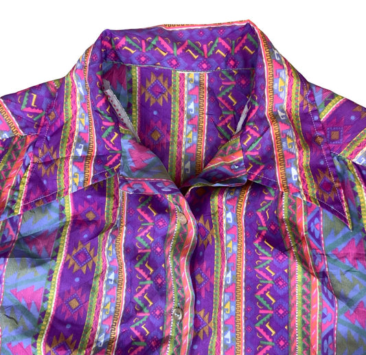 VTG 70/80s PURPLE BLUE GREEN RETRO AZTEK GEOMETRIC STRIPED LONG SLEEVE BLOUSE 12