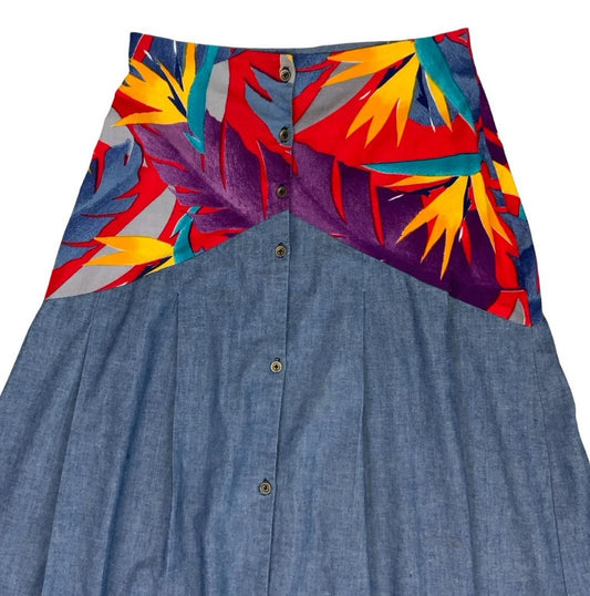 VTG 80s 'PIN-UP' HIGH WAIST LONG DENIM PATCHWORK BOTANICAL BOHO MIDI SKIRT S 8