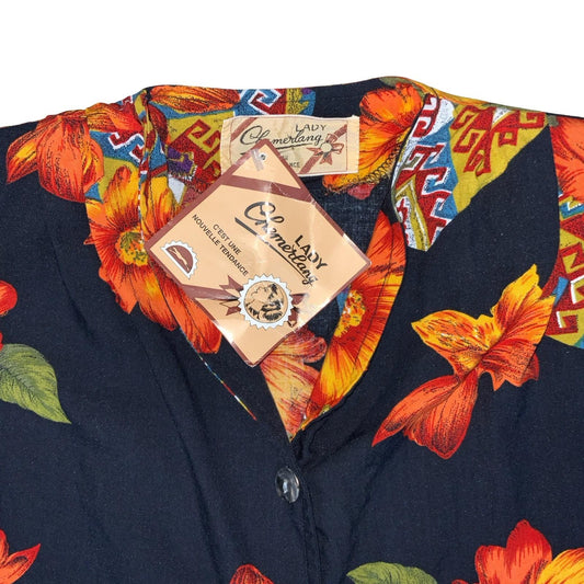 80s 'LADY CHEMERLANG' FRENCH BLACK ORANGE FLORAL DEADSTOCK BUTTON-UP BLOUSE S 8