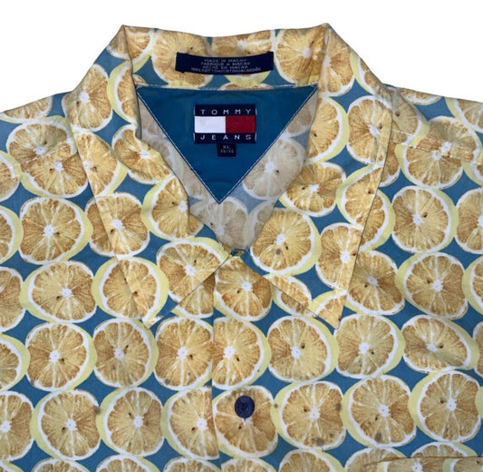 VTG 80S 90S TOMMY JEANS YELLOW BLUE LEMON SHORT SLEEVED SHIRT XL