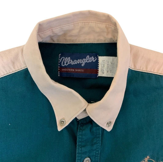VTG 80S WRANGLER WESTERN GREEN BEIGE RODEO RETRO LONG SLEEVED SHIRT L