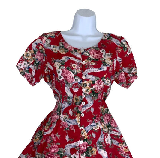 VTG 90s 'DE VILLE' RED FLORAL MINI SUMMER BEACH SKATER DRESS M 12
