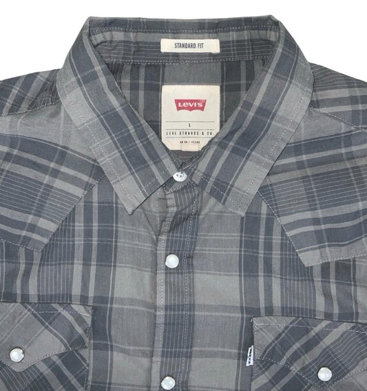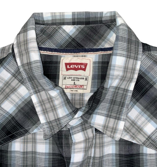 VTG 90S LEVI'S GREY CHECKED SHORT SLEEVED SNAP BUTTON SHIRT M