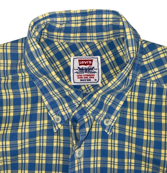 VTG 90S LEVI'S BLUE YELLOW PLAID CASUAL SHORT SLEEVED BUTTON DOWN SHIRT M 43"