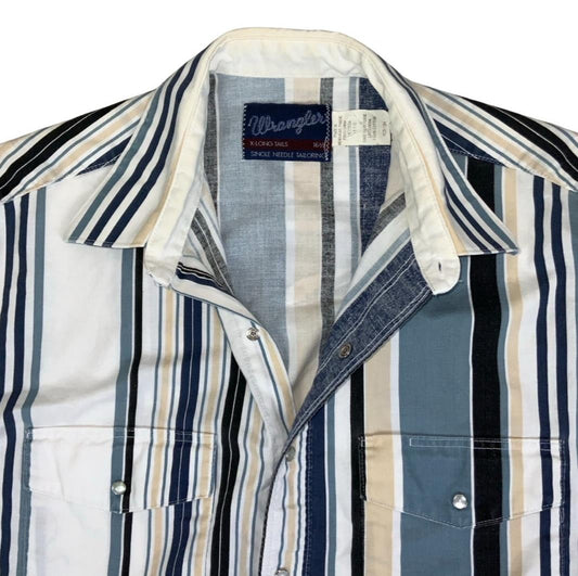 VTG 90S WRANGLER WHITE BLUE STRIPED PEARL SNAP WESTERN SHIRT LARGE 46"