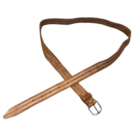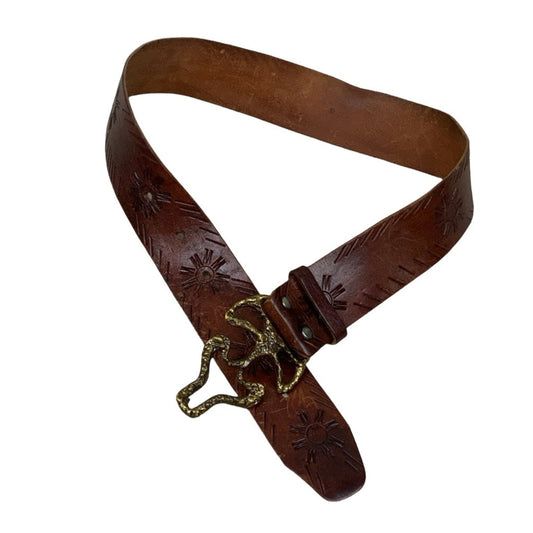Vintage 80s 90s Thick Brown Carved Leather Unique Pin Buckle Belt