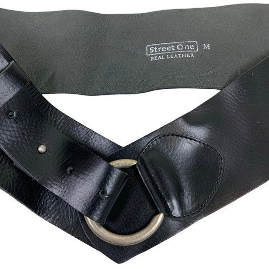 Vintage 90s 00s Y2k ‘Street One’ Thick Black Leather Unique Flap Loop Silver Ring Belt