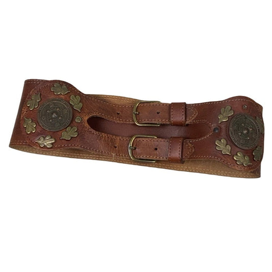 Vintage 70s 80s Brown Leather Gold Botanical Studded Double Prong Buckle Belt