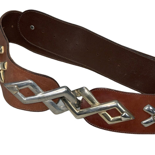 Vintage 70s 80s Brown Leather Gold Silver Geometric Statement Buckle Belt