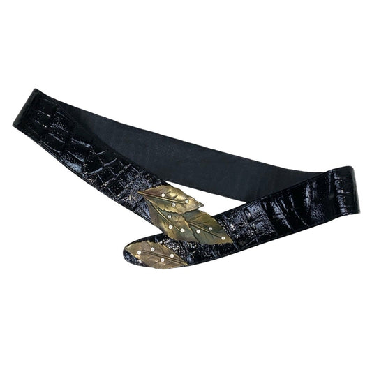 Vintage 80s Black Textured Glossy Leather Diamante Brass Leaf Buckle Belt