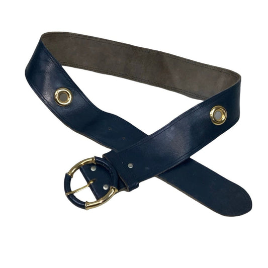 Vintage 80s 90s Blue Gold Leather Circular Buckle Belt