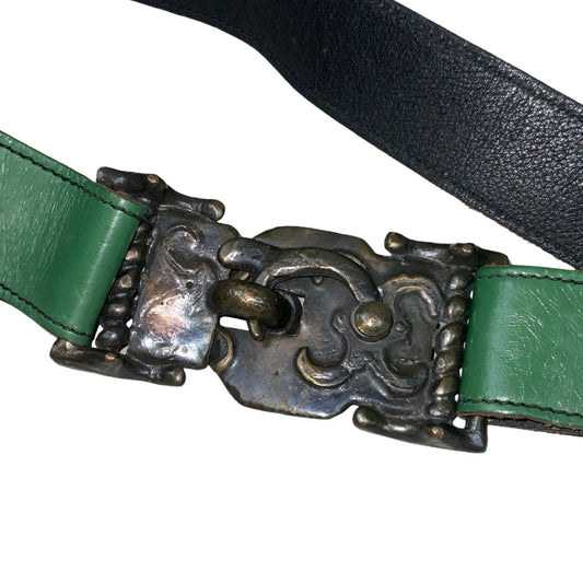 Vintage 80s 90s Green Gold Leather Unique Flip Lock Buckle Belt