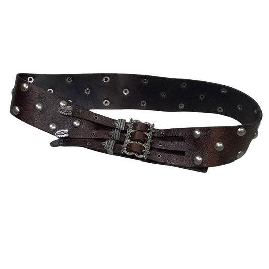 Vintage 70s 80s Brown Leather Statement Corset Studded Triple Ornate Silver Buckle Belt