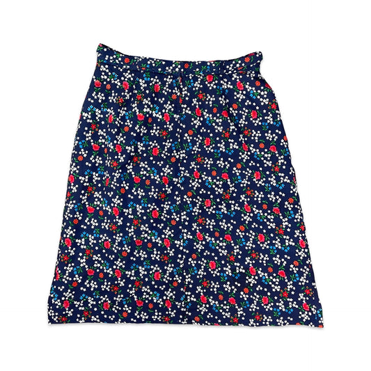 Vintage Navy White Green & Red Floral Print A-line Midi Skirt 4 6