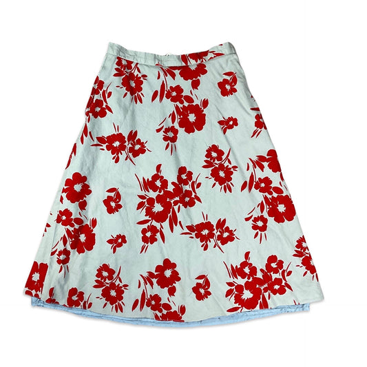 Vintage Black White & Red Floral Print Midi Skirt 6 8