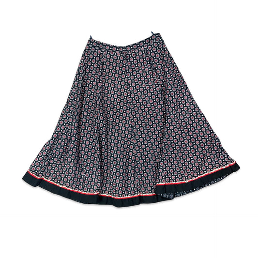 Vintage Black White & Red Floral Print Midi Skirt 6 8