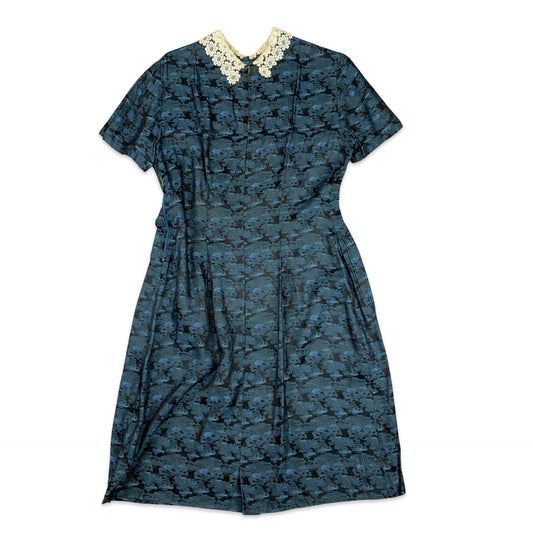Vintage 60s Lace Collar Geo Printed Midi Shift Occasion Dress Blue Black White 10 12