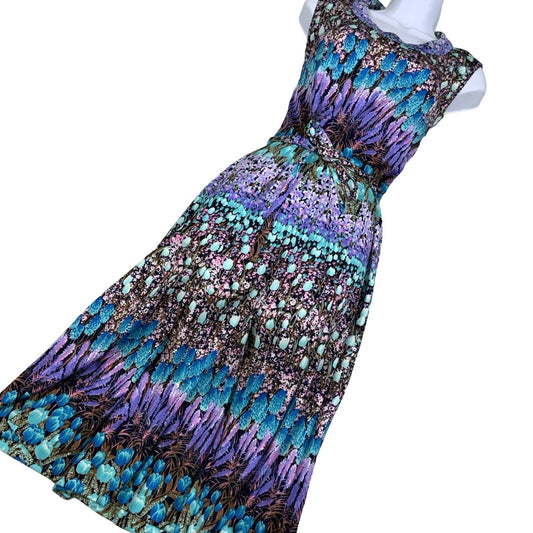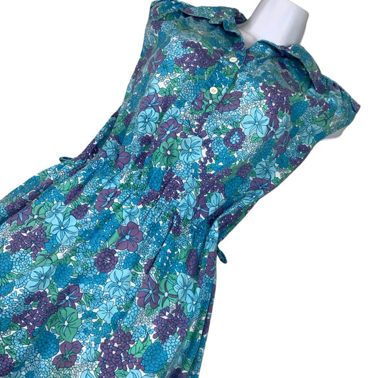 Vintage 80s Blue Purple Green Floral Sleeveless Summer Dress 10 12