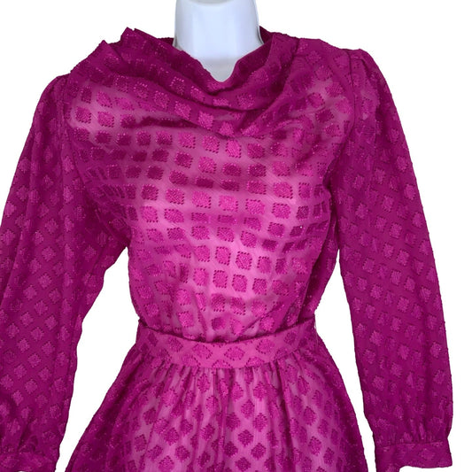 Vintage 70s 80s Pink Textured Diamond Cowl Neck Drop Waist Midi Dress 10 12