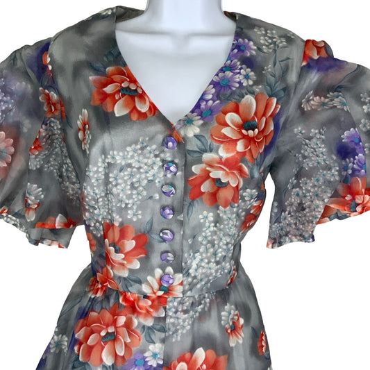 Vintage 70s Grey Purple Orange Floral Aline Maxi Dress 12 14