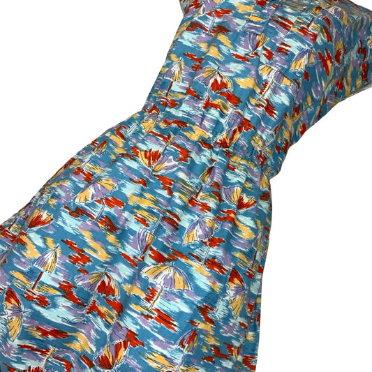 Vintage 80s Sleeveless Blue Yellow White Umbrella Patterned Midi Summer Dress 12 14