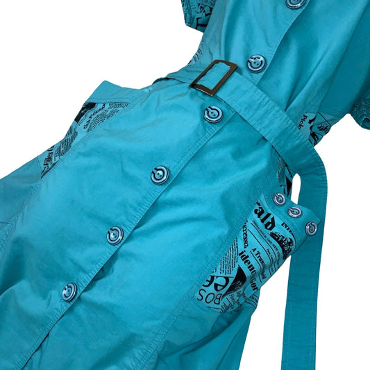 Vintage 80s Blue Black Newspaper Patterned Summer Shirt Dress 12 14