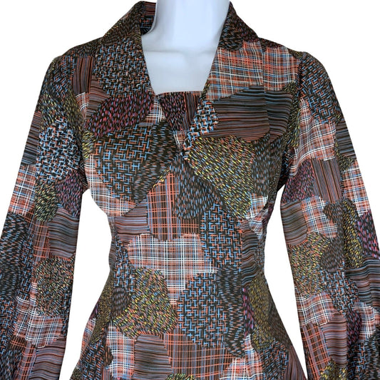 Vintage 70s Dog-Ear Collar Purple Blue Yellow Abstract Midi Dress 10 12