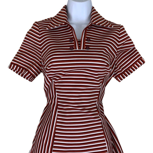 Vintage 60s 70s Red White Brown Stripe Mini Shirt Dress 10 12