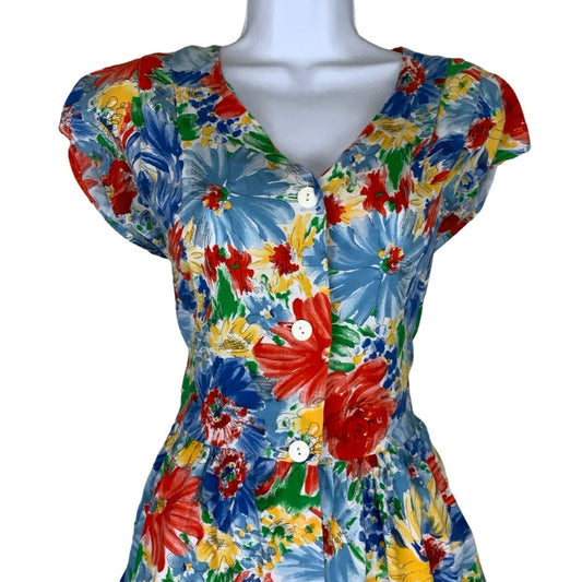 Vintage 80s Red Blue Yellow Green Floral Summer Dress 10 12
