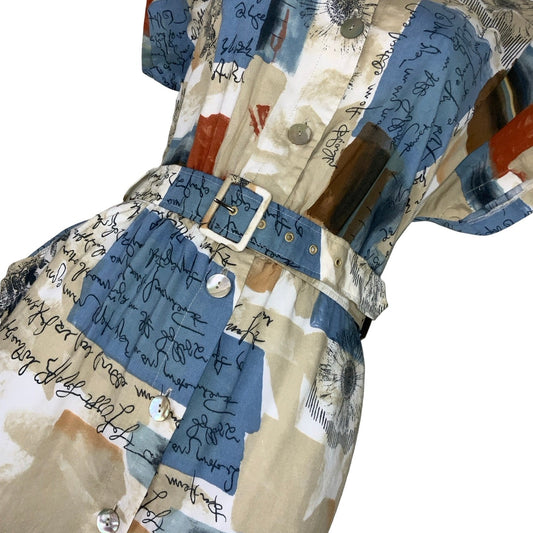 Vintage 80s Blue Red Brown Scrapbook Art Pastel Patterned Summer Dress 8 10