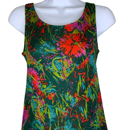 Vintage 70s 80s Green Pink Red Paint Splash Floral Sleeveless Maxi Dress 4 6 8 10