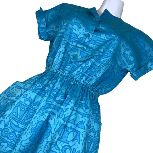 Vintage 80s ‘Lobey’ Blue Abstract Print Pockets Aline Summer Midi Dress 4 6