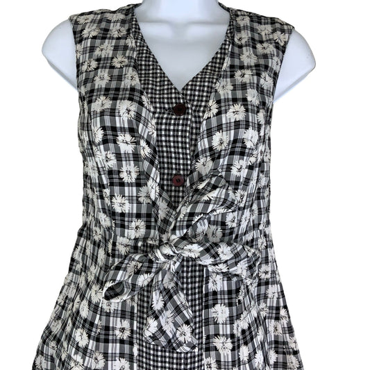 Vintage 90s Black White Floral Check Gingham Sleeveless Maxi Dress 8 10