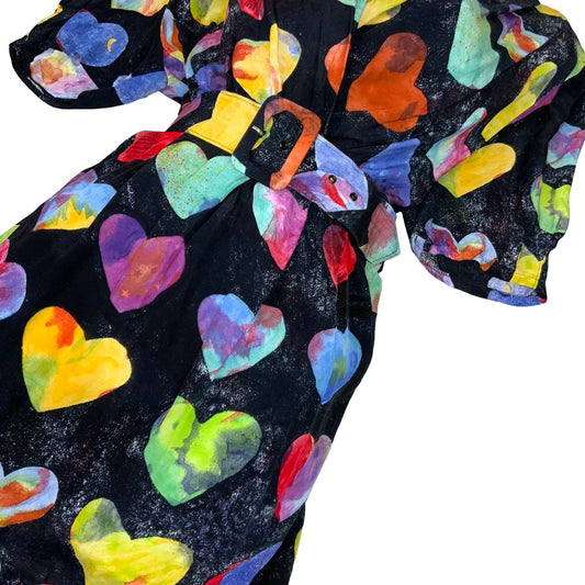 Vintage 80s 90s ‘Betty Barclay’ Black Multicoloured Love Heart Pockets V-Neck Aline Mini Dress 10 12