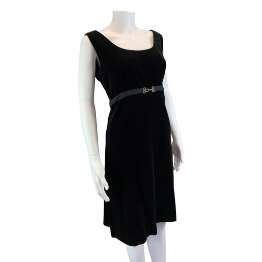 Vintage 60s 70s Black Velvet Belted Sleeveless Mid Length Mod Dress S 8/10