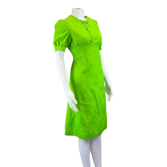 Vintage Green 60s Style Floral Bow Puff Sleeve Mod Dress 8 10 S