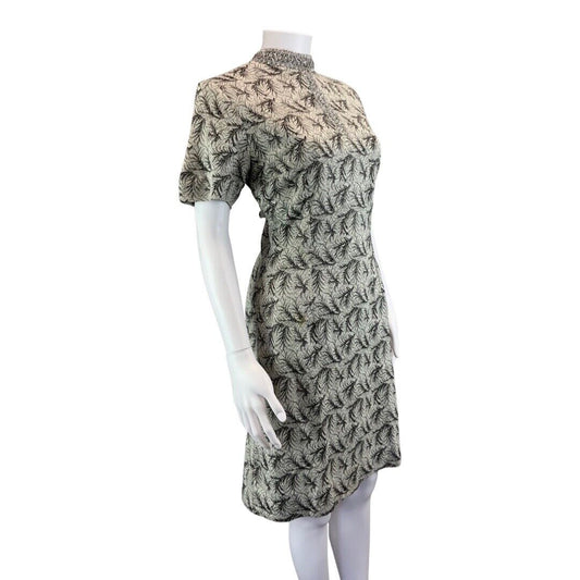 Vintage 60s 70s Silver Grey Embellished Short Sleeve Leaf Pattern Dress 8 10 S