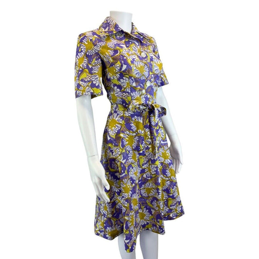 Vintage 70s Purple Yellow Floral Psychedelic Pattern Belted Shirt Dress 8 10 S
