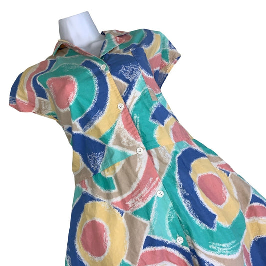 Vintage 90s Blue Green Prink Yellow White Pastel Midi Shirt Dress 14